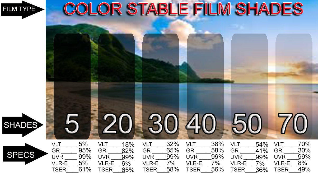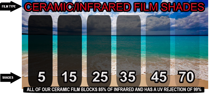 This brand is some of the highest 2 stage Nano Ceramic film Available. All shades block up to 85% of the InfraRed Rays. You get Maximum Heat Rejection.